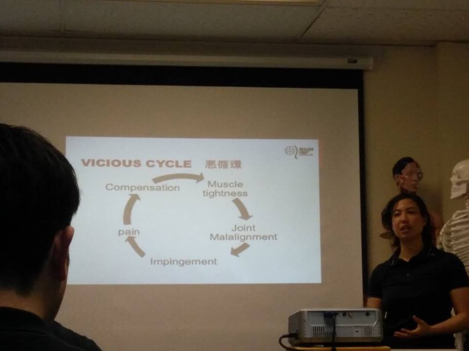 trainer as a guest speaker this time. She introduced “The Realine Concept” which is proposed by Mr. Gamada in Japan. The goal of this concept is “Optimizing Joing alignment and kinematics”. Also, she talked about how important to seek the cause of the problem and break out of the vicious cycle that is caused by the problem. It was a very good opportunity to learn another way to approach the body. (Misuzu)