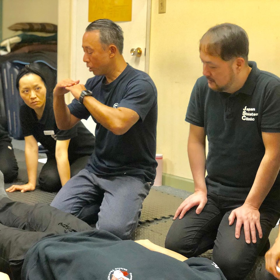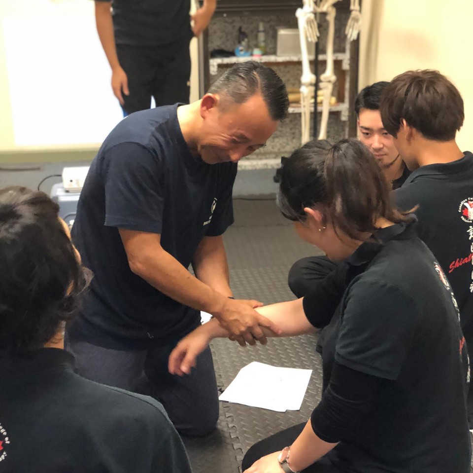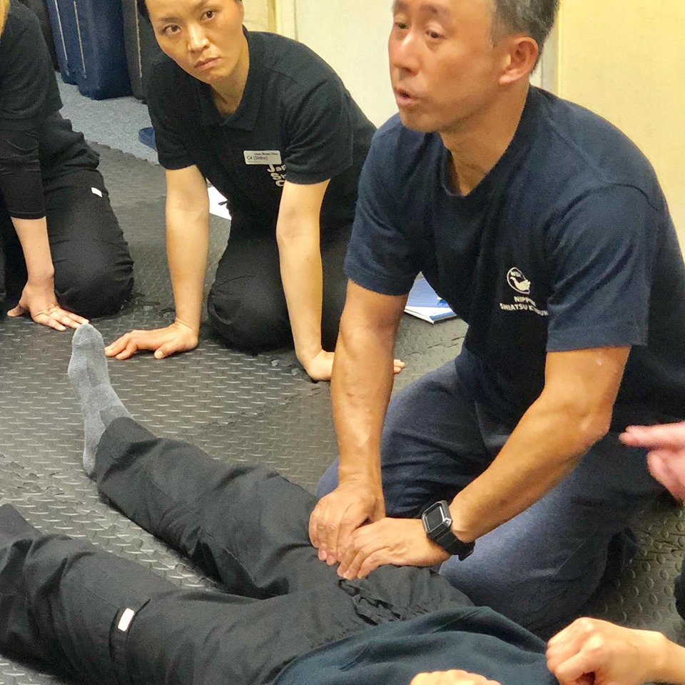 We had Shigeru Izawa sensei who is an Acupuncturist and Shiatsu therapist in Japan as a guest speaker and shared his techniques. Izawa-sensei taught us the importance of feeling muscles, paying attention to the direction and angle of the thumb toward muscles, using four fingers of each hand to support the muscle firmly and applying pressure using body weight from foot to arm. We were able to apply stronger pressure without placing excessive stress on the thumb. Thank you so much, Izawa sensei. (Nobu)